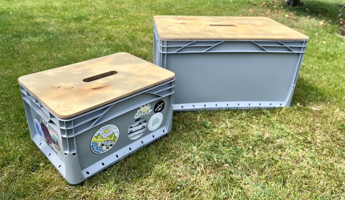 Für die Organisation im Kofferraum unseres Bullis nutzen wir überwiegend Euroboxen. Die sind leicht, preiswert und quasi unzerstörbar. Dazu lassen sie sich gut reinigen und stapeln. Wir haben meist Boxen mit den Maßen 30 x 40* und 40 x 60* cm dabei.