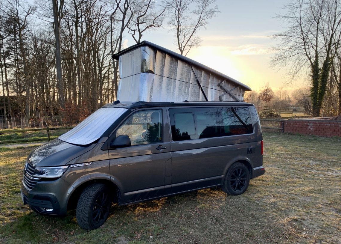 Das Aufstelldach des VW California besteht im Grunde genommen nur aus einem dicken Kunstfaser-Zeltstoff. Der hält zwar ein wenig Wind ab, aber bei Kälte muss der Stoff natürlich passen. Mit der Standheizung bekommt man den Bulli gut warm, doch im Obergeschoss kann die Wärme dann auch schnell wieder raus. Um das zu verhindern gibt es viele Möglichkeiten. Eine sehr verbreitete Idee ist es, eine Art Haube über das ganze Dach zu stülpen. Damit hat man dann zwei Lagen Stoff, bei denen der Zwischenraum für eine gewisse Isolierung sorgt. Diese Hauben, oder Calicaps, sind mit gut 300 bis 500 Euro recht teuer. Und da wir (noch) eher Schönwetter-Camper sind, wollten wir (noch) nicht so viel Geld ausgeben.