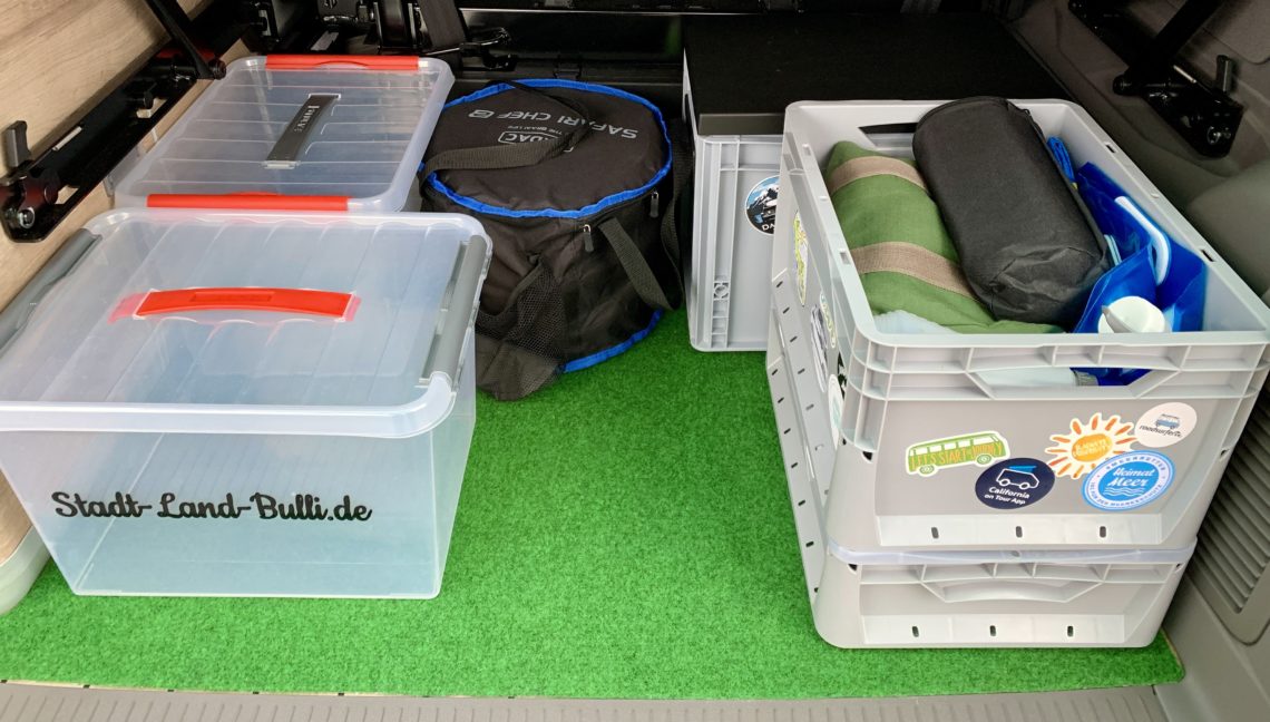 Auch wenn es beim Camping entspannt zugeht, Ordnung muss sein. Sonst findet man irgendwann nichts mehr wieder. Der Kofferraum des Bullis bietet zwar genug Stauraum, sollte aber auch sinnvoll eingeräumt werden. Dabei helfen uns drei transparente Aufbewahrungsboxen*. Man sieht sofort was drin ist und durch den Deckel bleibt alles sauber und trocken. Wir nutzen die Kisten für Klamotten und Lebensmittel.