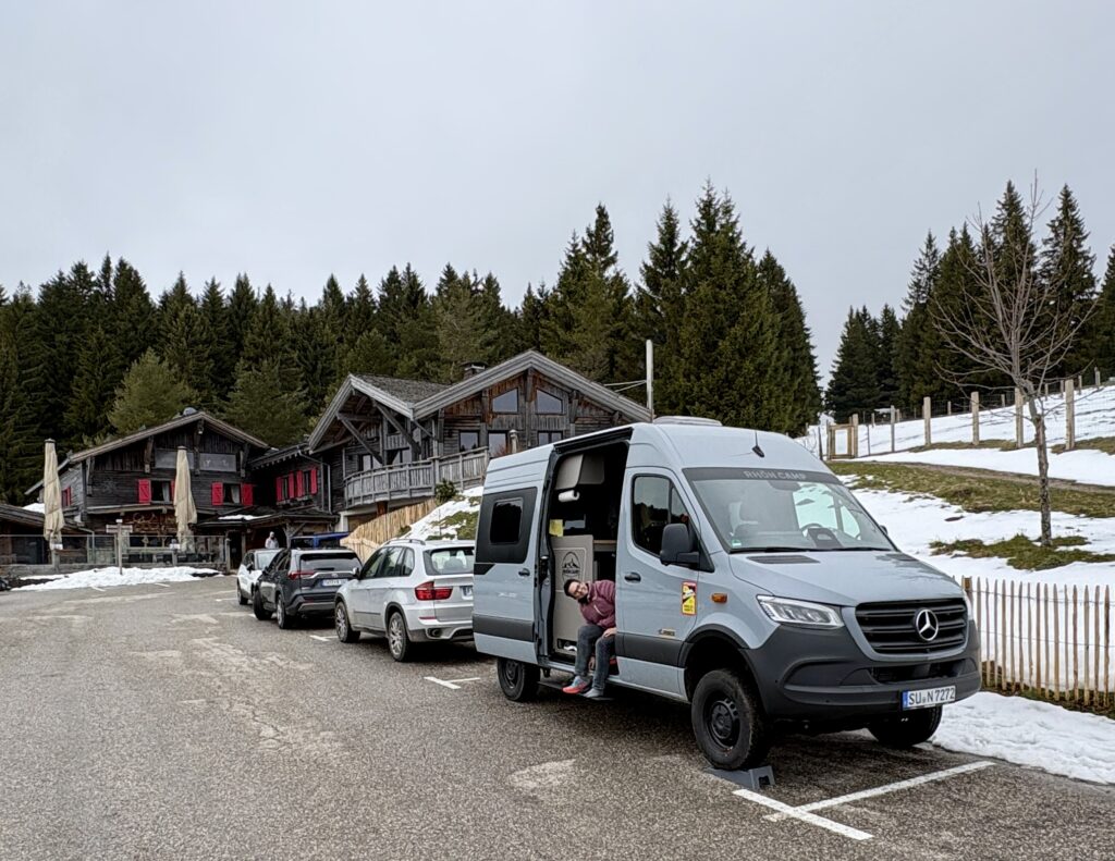 Wir sind beeindruckt von dem vielen Schnee, der hier auf den Bergen noch liegt, wärmen uns aber erstmal bei Crepes und Cappuccino in der Herberge auf. Auf unsere Frage an die Chefin, ob wir auf dem Parkplatz übernachten dürfen, wird uns dafür ein Preis von fairen 6 Euro genannt.