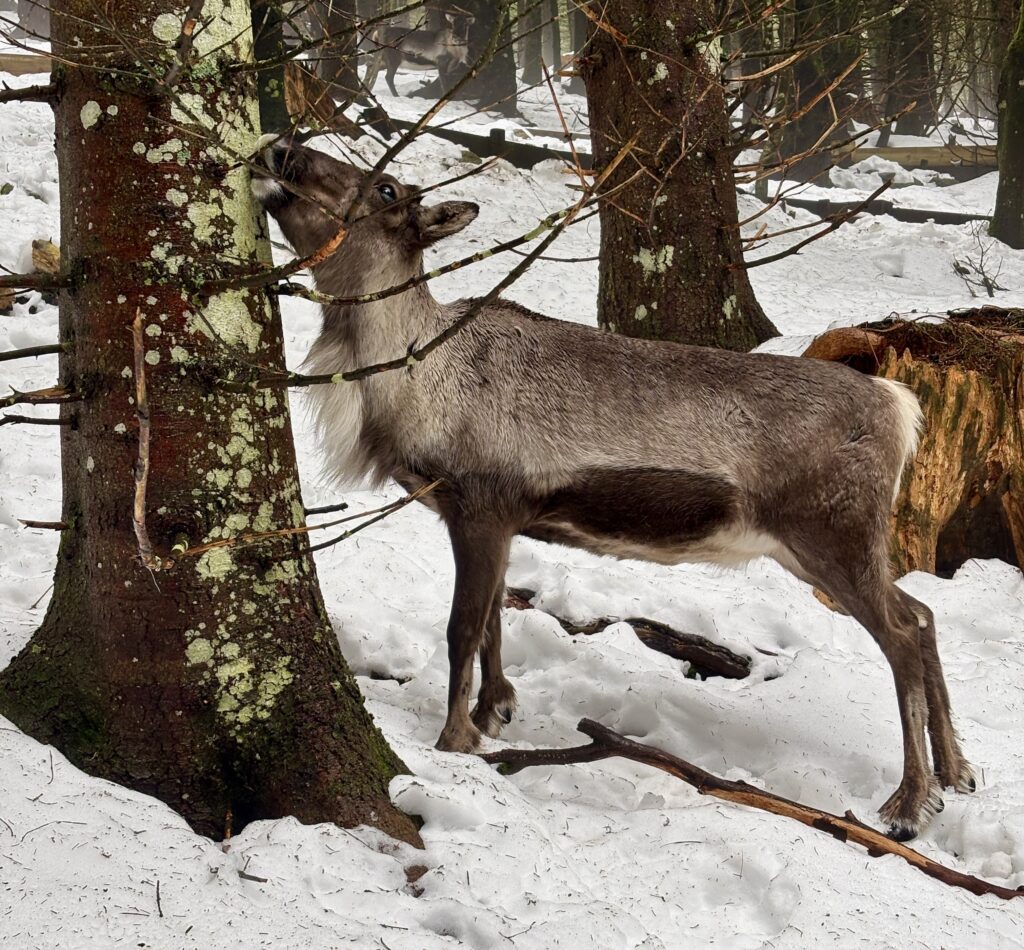 Nach der kleinen Stärkung besuchen wir das zur Herberge gehörende Rentier-Gehege an. Hier lebt ein ganzes Rudel und man kann dabei mitten durch das Gehege laufen und kommt so sehr dicht an die Tiere heran. Denen scheint der Besuch allerdings ziemlich egal zu sein.