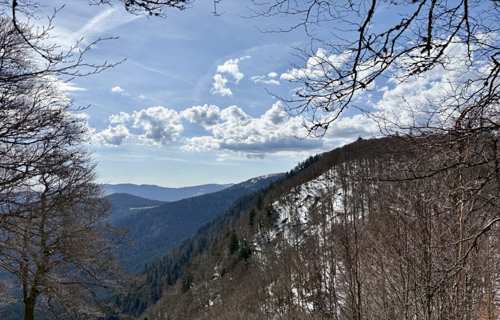 Nur etwa einen dreiviertel Stunde dauert die Fahrt zum Col de la Schlucht. Auf 1.139 Metern liegt der Pass, der eine wichtige Verkehrsachse zwischen dem Elsass und Lothringen ist. Wir gehen ein wenig spazieren und genießen den Fernblick, bevor es weiter in Richtung Munster geht.
