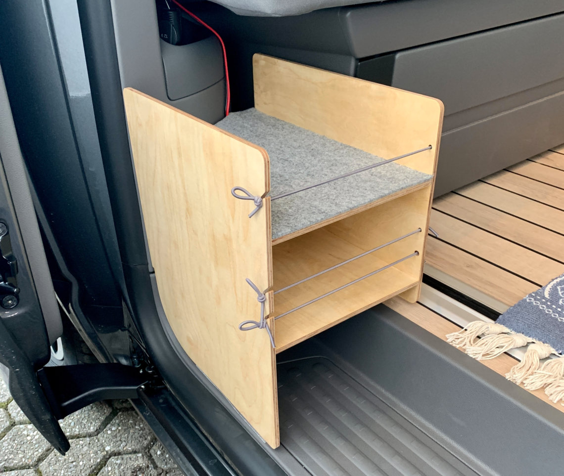 Die Lösung findet sich, wie so oft, bei anderen Bulli-Fahrern. Findige Leute haben ein kleines Regal entwickelt, welches im linken Bereich der Trittstufe befestigt wird und somit für Ordnung im Schuh-Chaos sorgt.